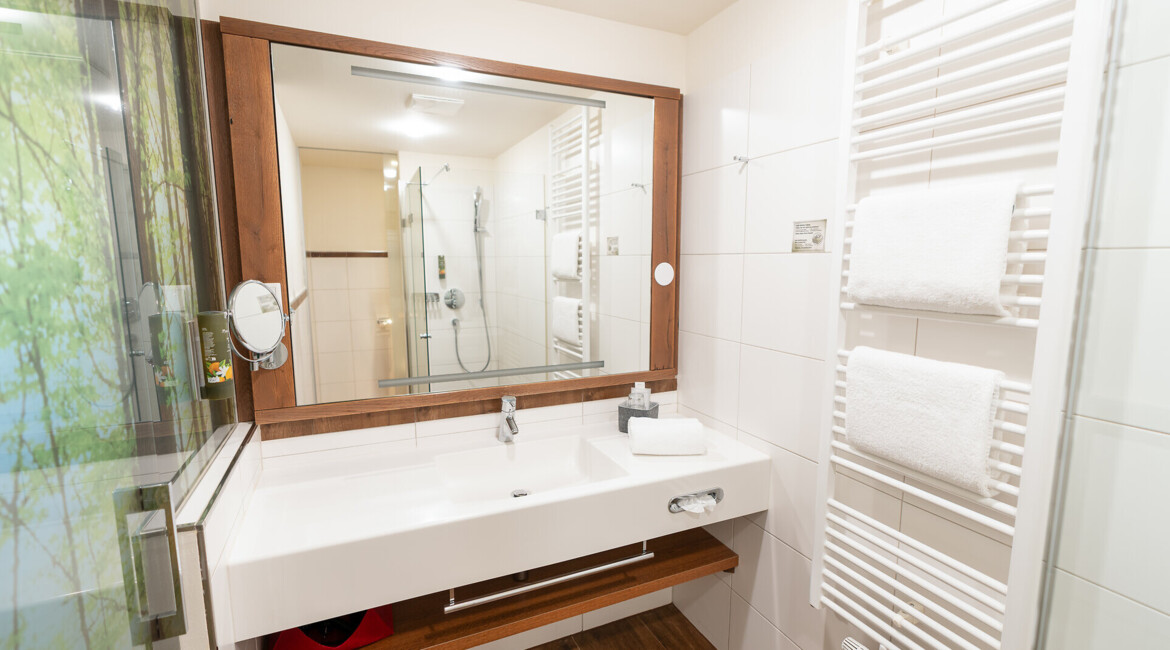 Badezimmer mit Kosmetikspiegel, Haartrockner, hochwertigen Pflegeprodukten